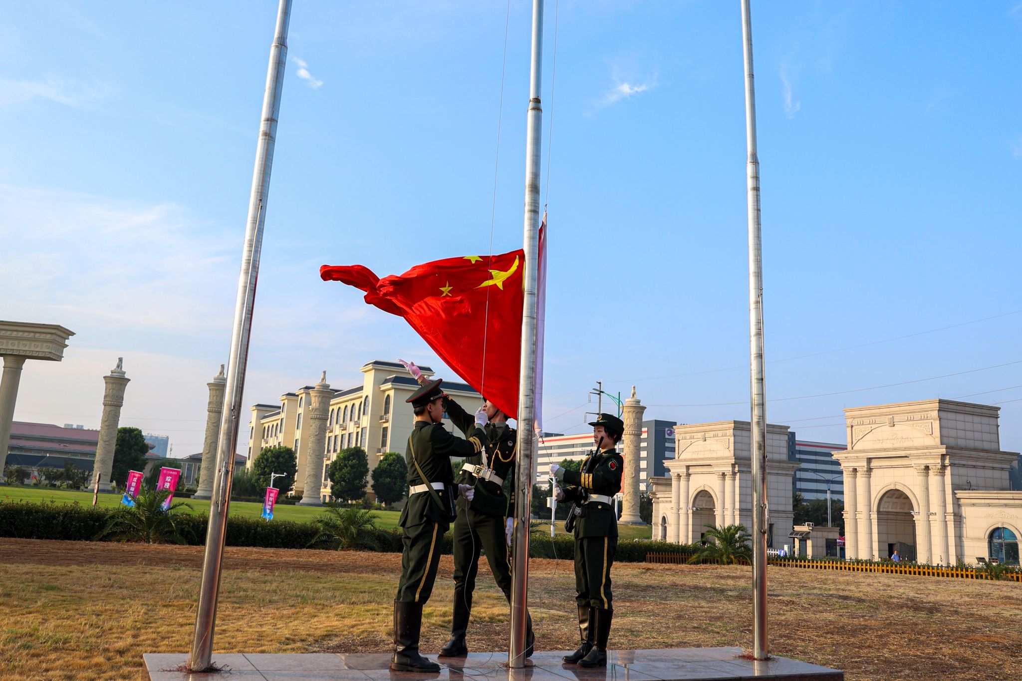朝阳映照,国旗冉冉升起;国歌嘹亮,声声回荡四方。