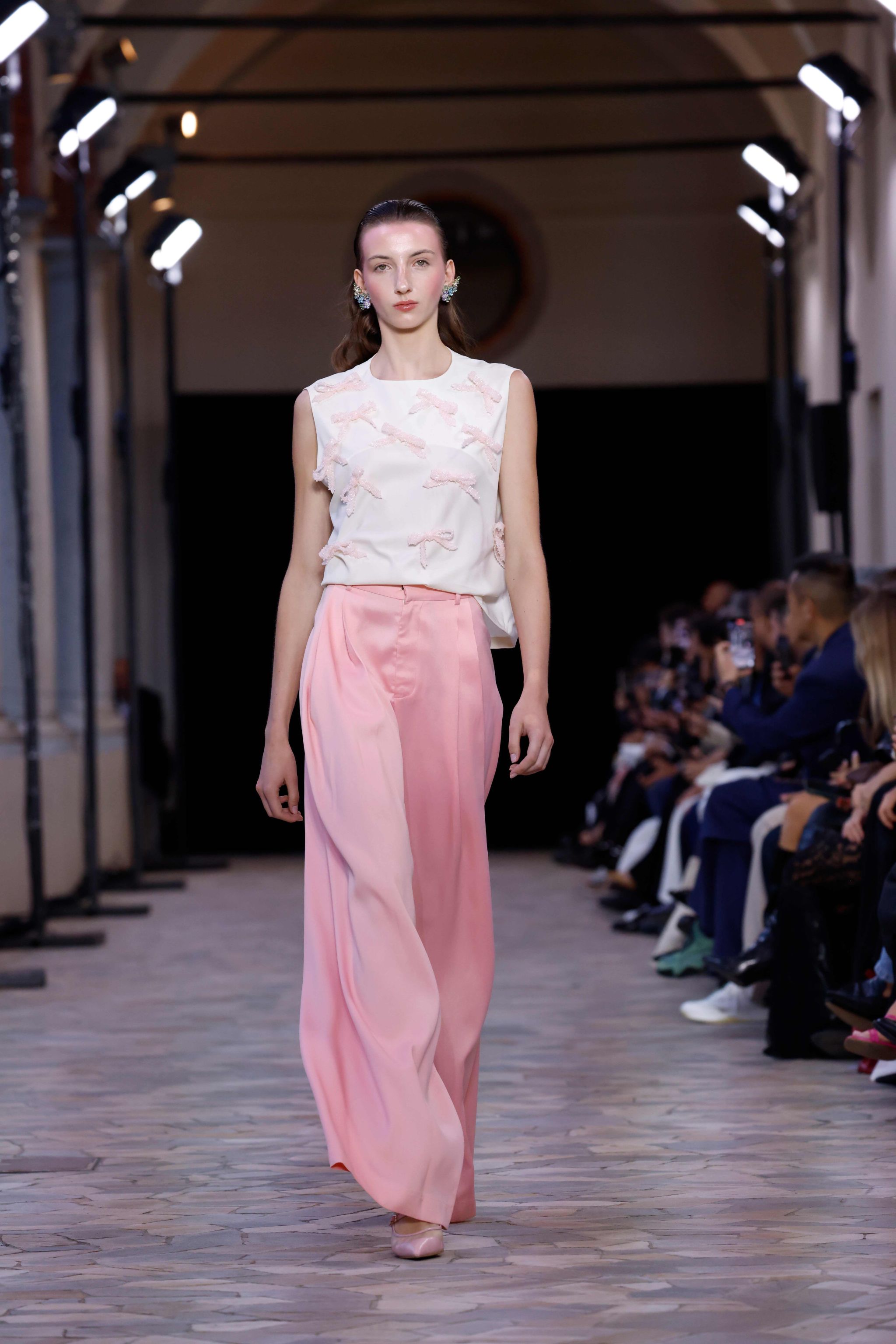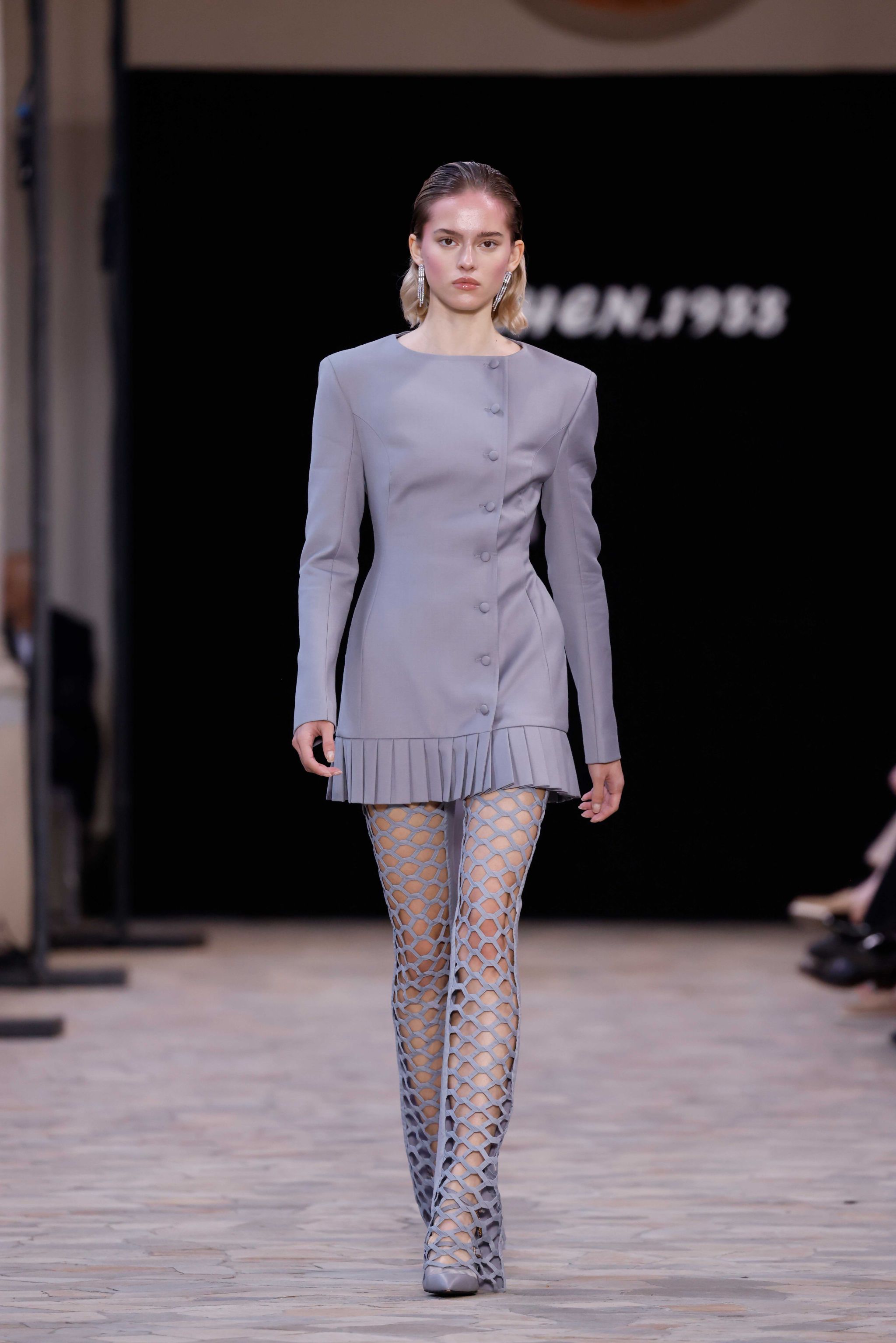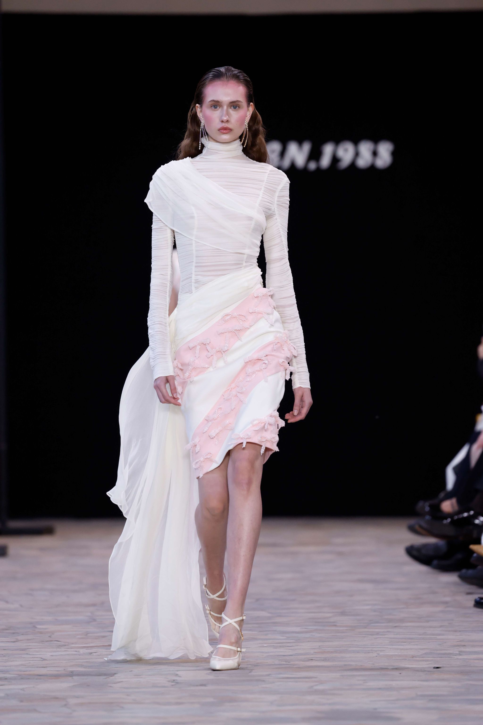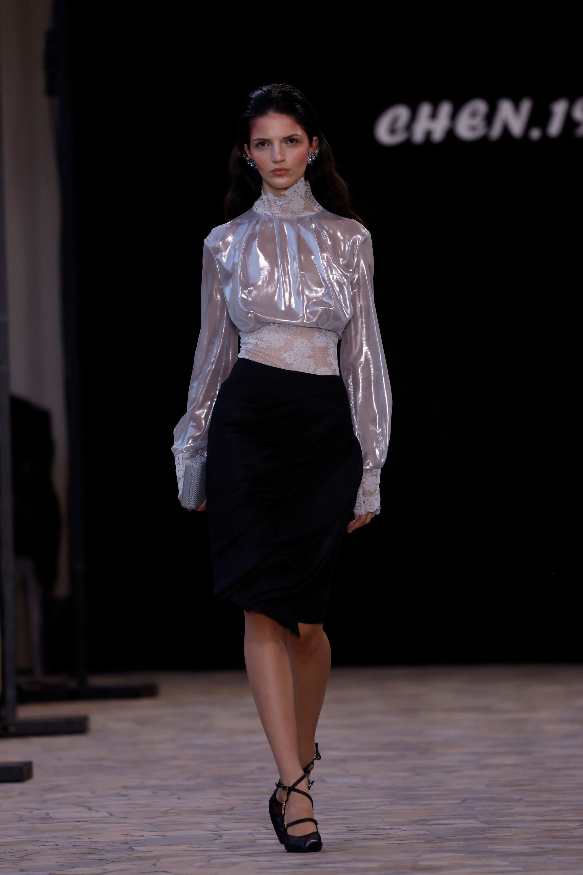 当钟楼的钟声悠然掠过黛色屋顶,新晋“金顶奖”得主陈龙的“理想之秋”专场发布会浪漫启幕。长廊地砖映着夕照与灯影,与模特裙摆上的渐变粉晕交织生辉,手工串珠蝴蝶结随步轻颤,蕾丝与镂空雕琢的立体肌理在廊柱间光影流转,肩部轮廓的利落剪影与远方钟楼的古典线条遥相呼应。陈龙以“秋”为诗,不拘于季节表象,而是借嫩粉与黑灰的碰撞、柔纱与锐利镂空的交织,在步履间勾勒出女性从容而丰富的内心图景。领口薄纱的抽褶细节打破传统优雅的边界,蓬蓬裙摆与当代廓形相融,在步履起落间传递出松弛而自信的东方美学态度,在松弛感中又蕴含蓬勃的设计张力,每一步都彰显着当代中国设计的独特魅力。