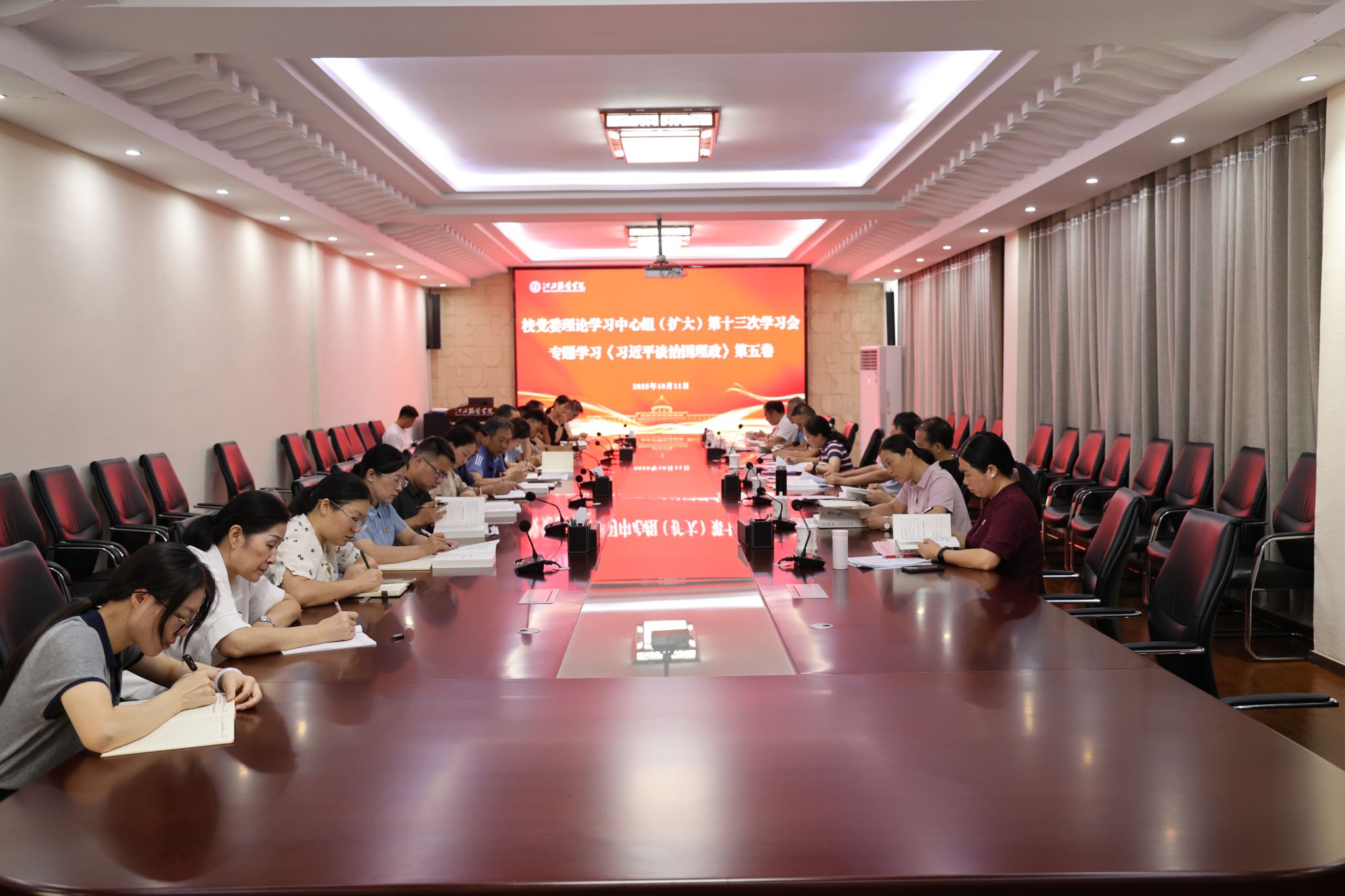 与会人员通过视频学习了中共中央办公厅转发的《中央宣传部、中央组织部关于认真组织学习〈习近平谈治国理政〉第五卷的通知》精神,校党委书记林井萍领学了《习近平谈治国理政》第五卷第一章《以中国式现代化全面推进中华民族伟大复兴》,校党委副书记、校长薛家宝领学了第五卷第五章《一体推进教育科技人才事业发展》。校党委副书记、纪委书记李宝君,党委委员、组织部部长陈翠娥围绕学习内容作了交流发言。
