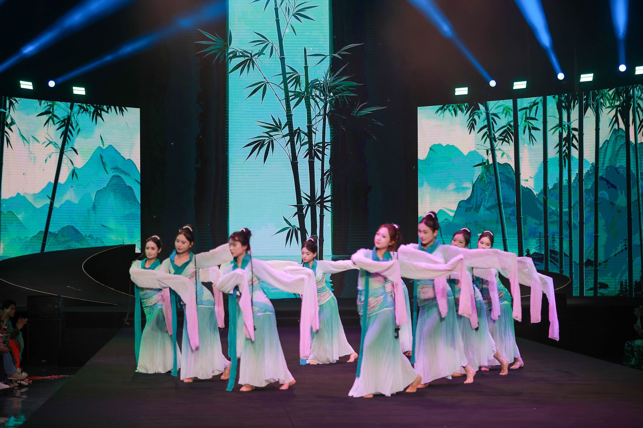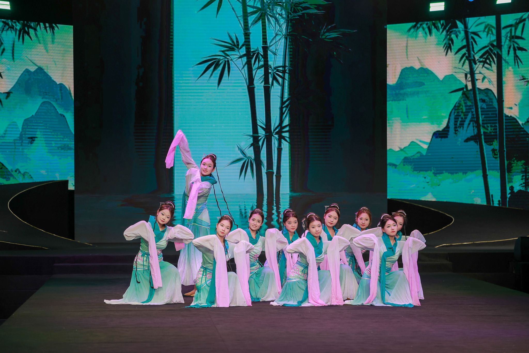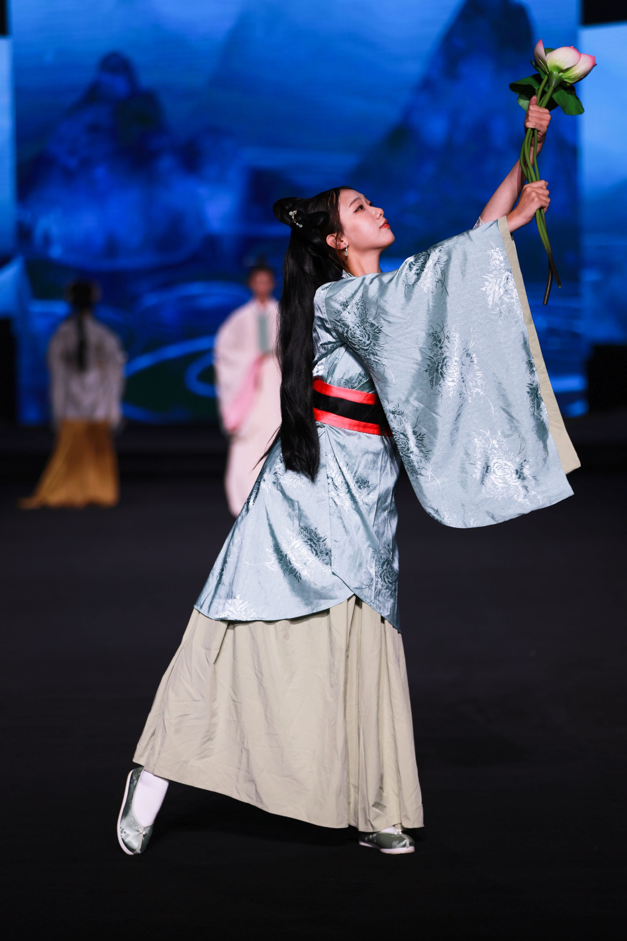 舞蹈《采薇》以《诗经》为魂,舞者长袖翩跹,步履轻盈,将古典诗意融入肢体语言,仿佛将观众带入了《诗经》的世界。她们的身姿摇曳、风姿绰约,每一个动作都充满了韵味与力量,将古典舞蹈的柔美与内涵展现得淋漓尽致,再现了先秦时代质朴而深情的审美意境。