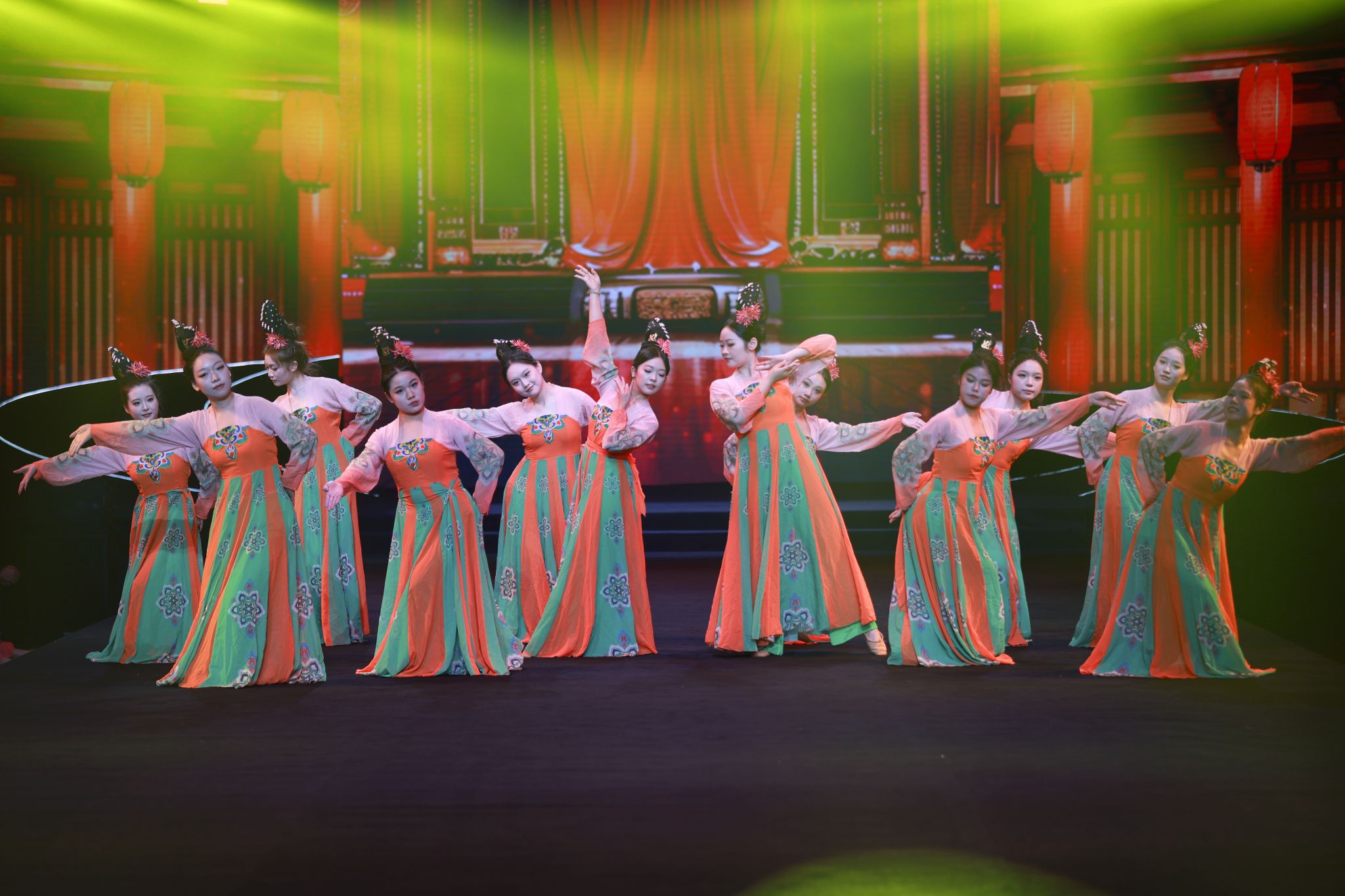 本年度的最大亮点之一,在于《唐锦宋韵》篇章的焕新呈现。原节目《大唐游春图》由更为经典恢弘的《霓裳羽衣舞》所取代。舞者们身着飘逸霓裳,伴随悠扬古乐翩翩起舞,其舞姿曼妙,阵容华美,淋漓尽致地再现了“大唐盛世,霓裳羽衣”的绝代风华,将观众带入了一个充满浪漫与幻想的大唐盛世。