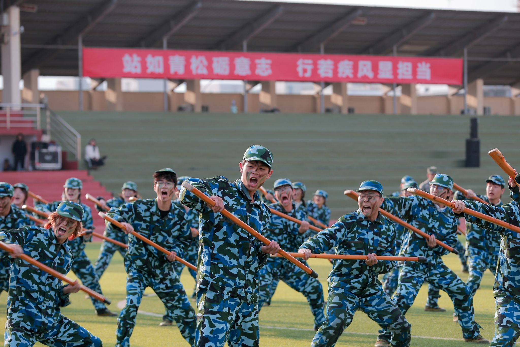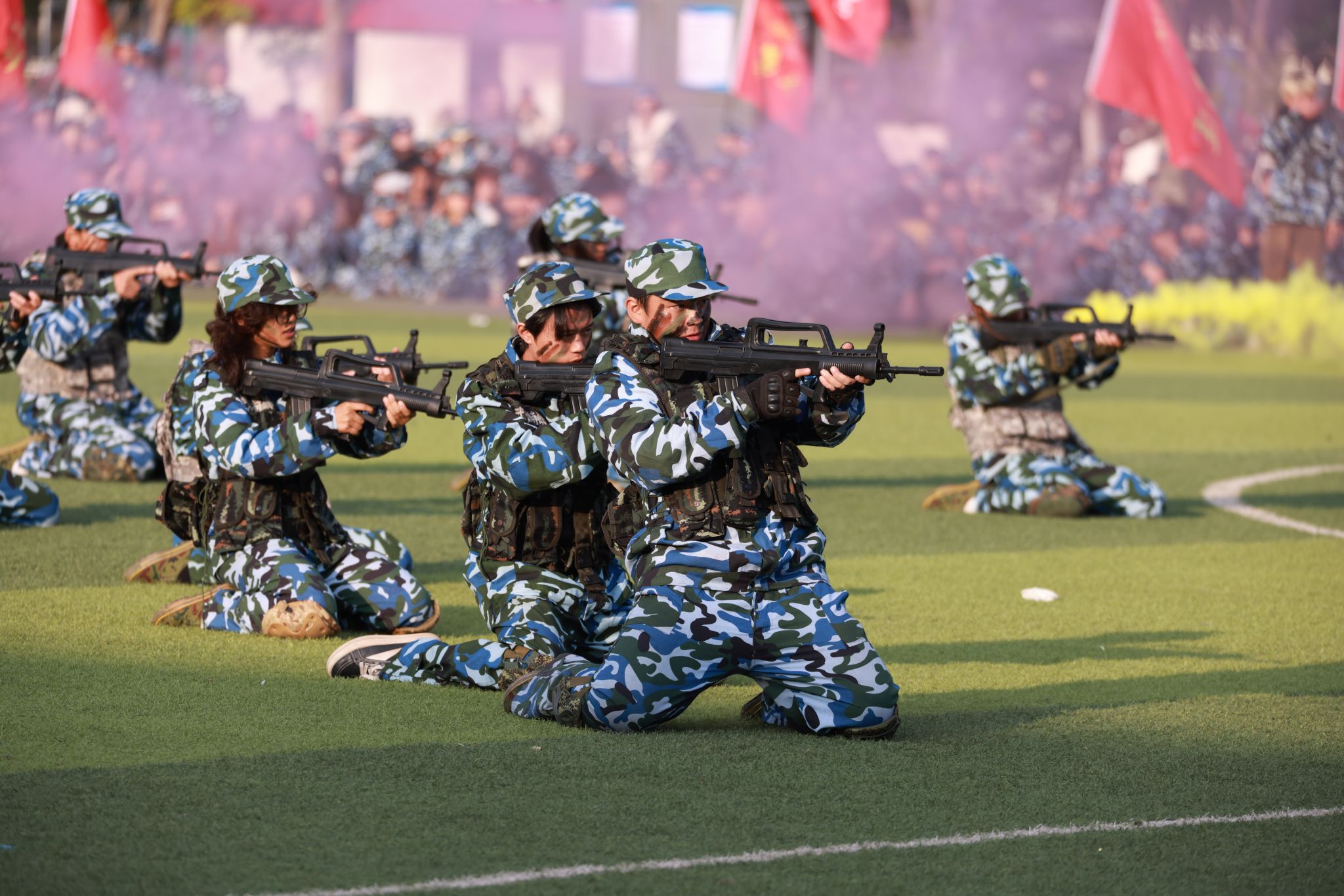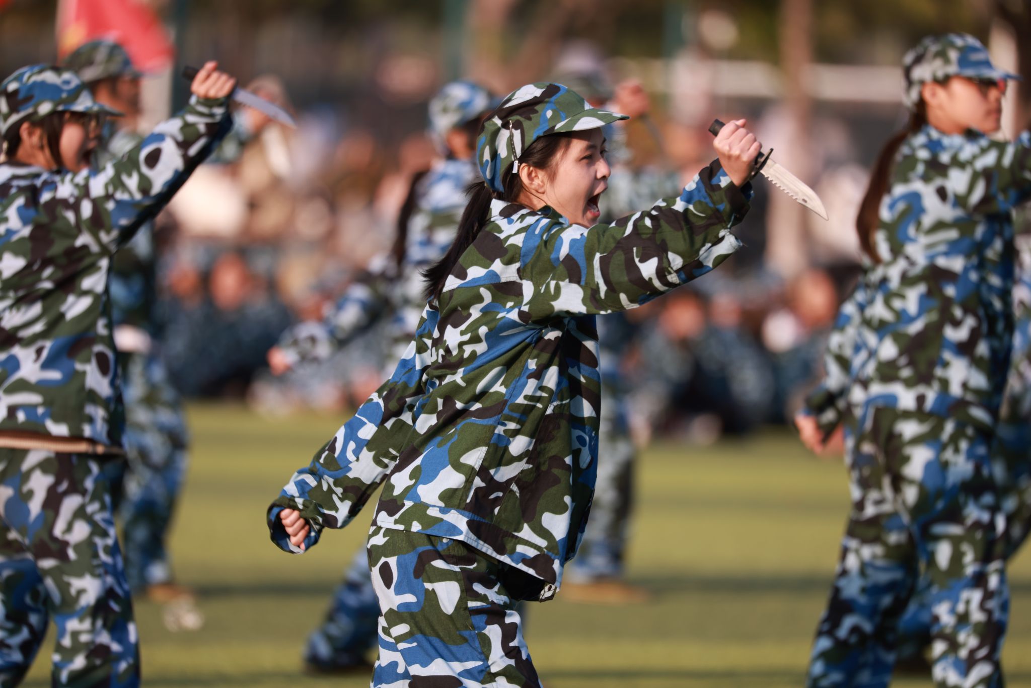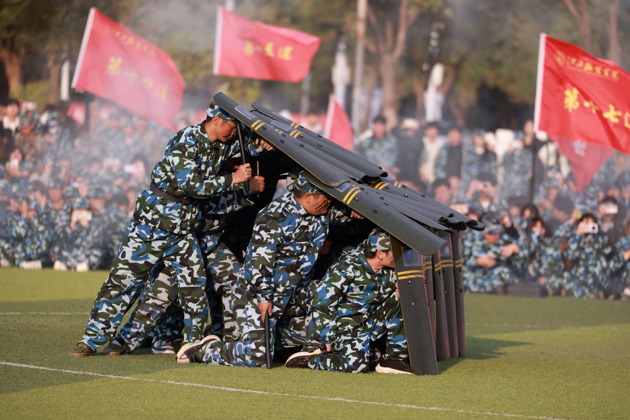 军训汇报表演开始,擒敌操方块阵出招迅速、攻防兼备,动作刚柔并济,一招一式有来有往;匕首操方块阵动作干脆利落,一套出鞘、弓步、上刺、侧刺等连招势如破竹;刺杀操方块阵步伐一致,动作干净利落,随指挥员一声令下,吼声如雷贯耳,震人心魄。随后开展的军事技能汇演精彩纷呈。擒敌拳刚劲有力,刺杀操杀气凛凛,匕首术英姿飒爽、高水平的战术军事项目表演将现场气氛推向高潮,田径场上掌声雷动,喝彩不断。