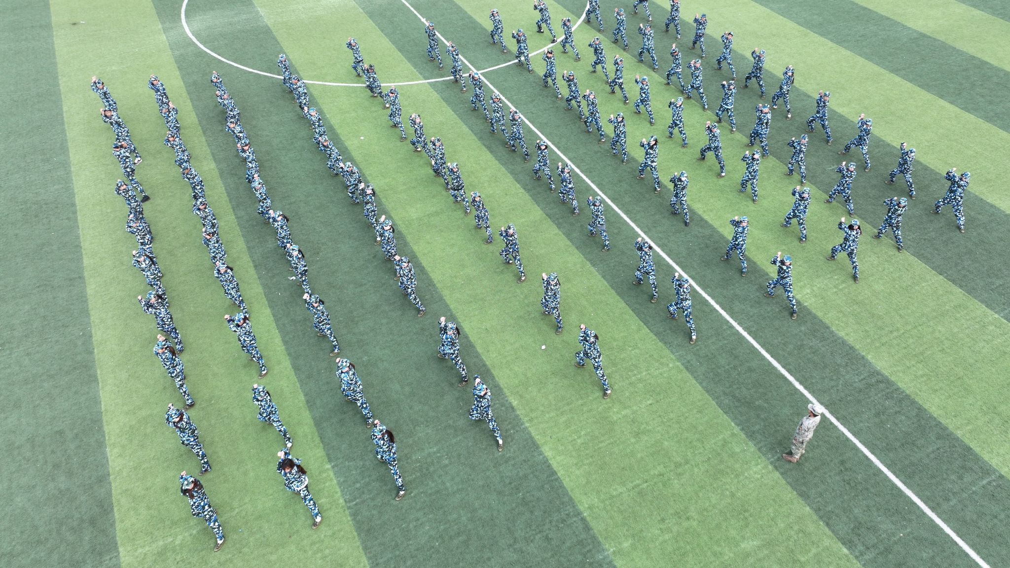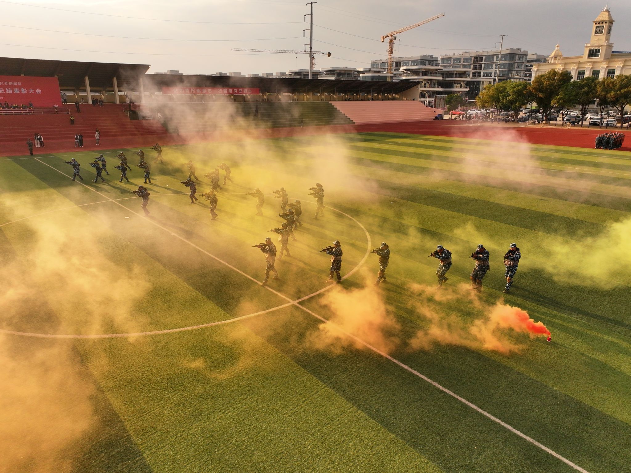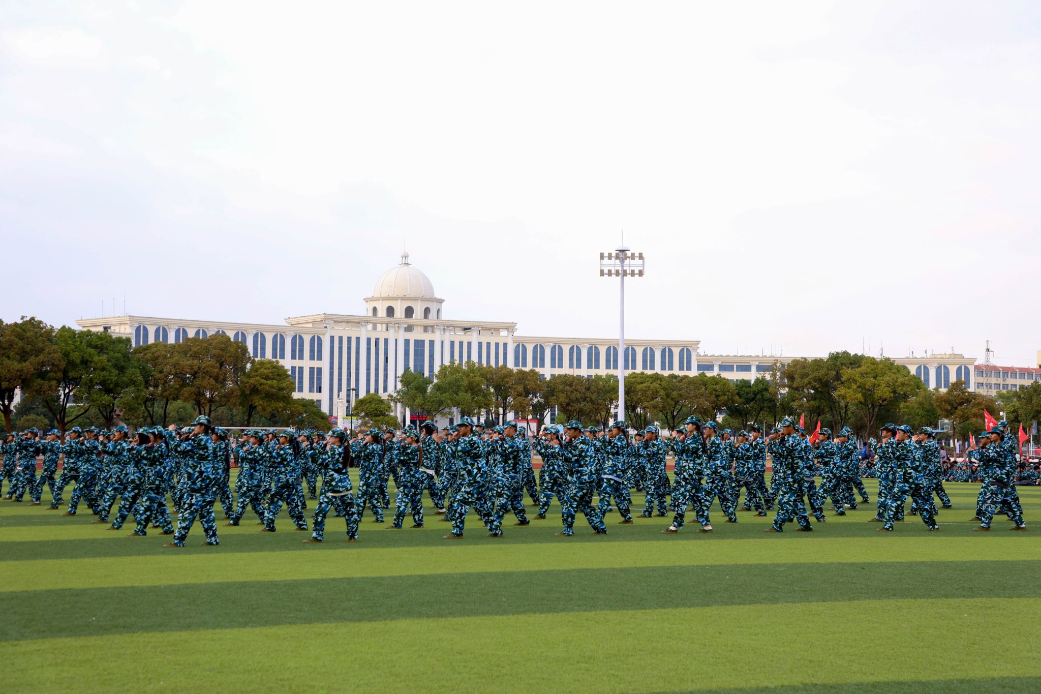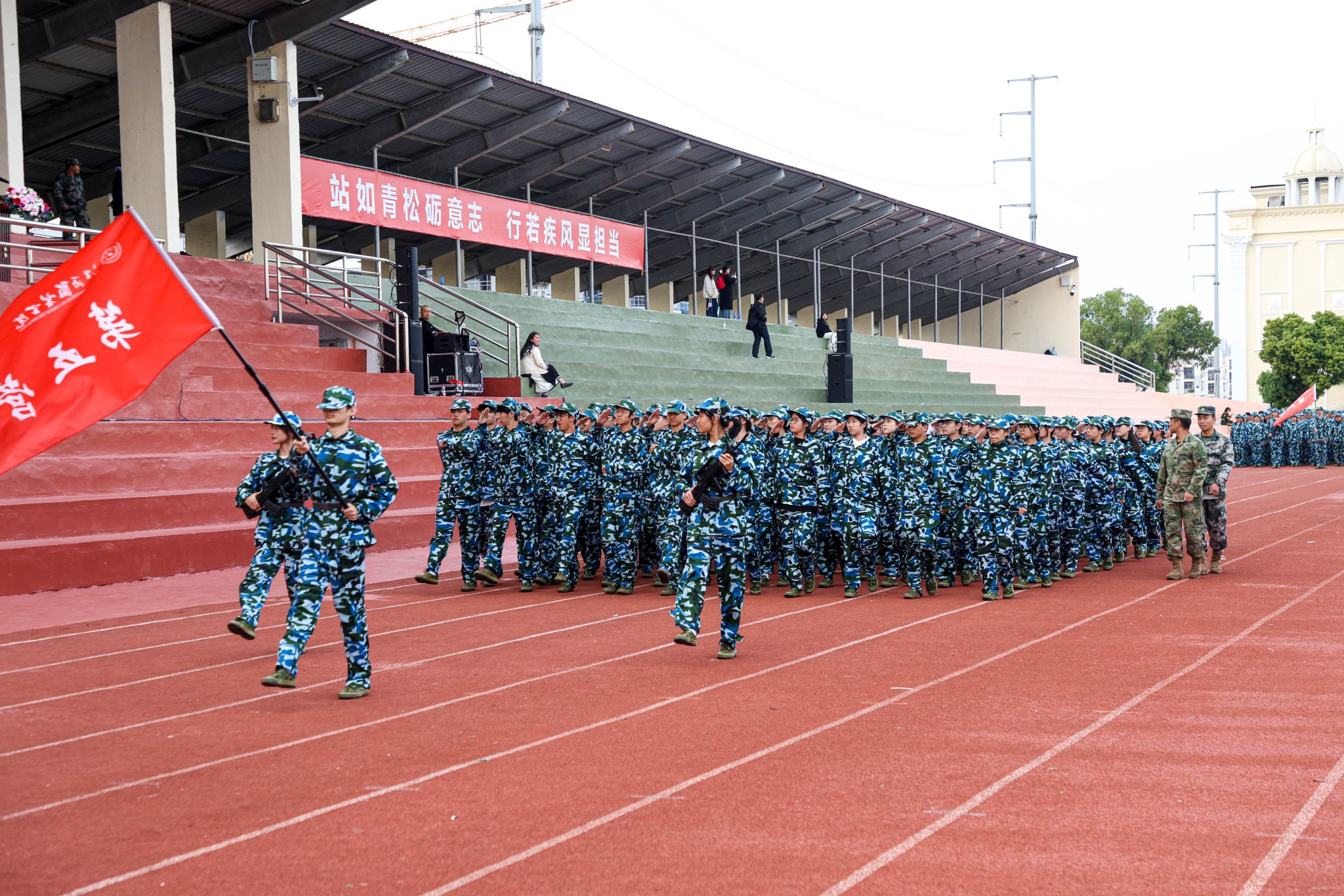 军训汇报表演开始,擒敌操方块阵出招迅速、攻防兼备,动作刚柔并济,一招一式有来有往;匕首操方块阵动作干脆利落,一套出鞘、弓步、上刺、侧刺等连招势如破竹;刺杀操方块阵步伐一致,动作干净利落,随指挥员一声令下,吼声如雷贯耳,震人心魄。随后开展的军事技能汇演精彩纷呈。擒敌拳刚劲有力,刺杀操杀气凛凛,匕首术英姿飒爽、高水平的战术军事项目表演将现场气氛推向高潮,田径场上掌声雷动,喝彩不断。