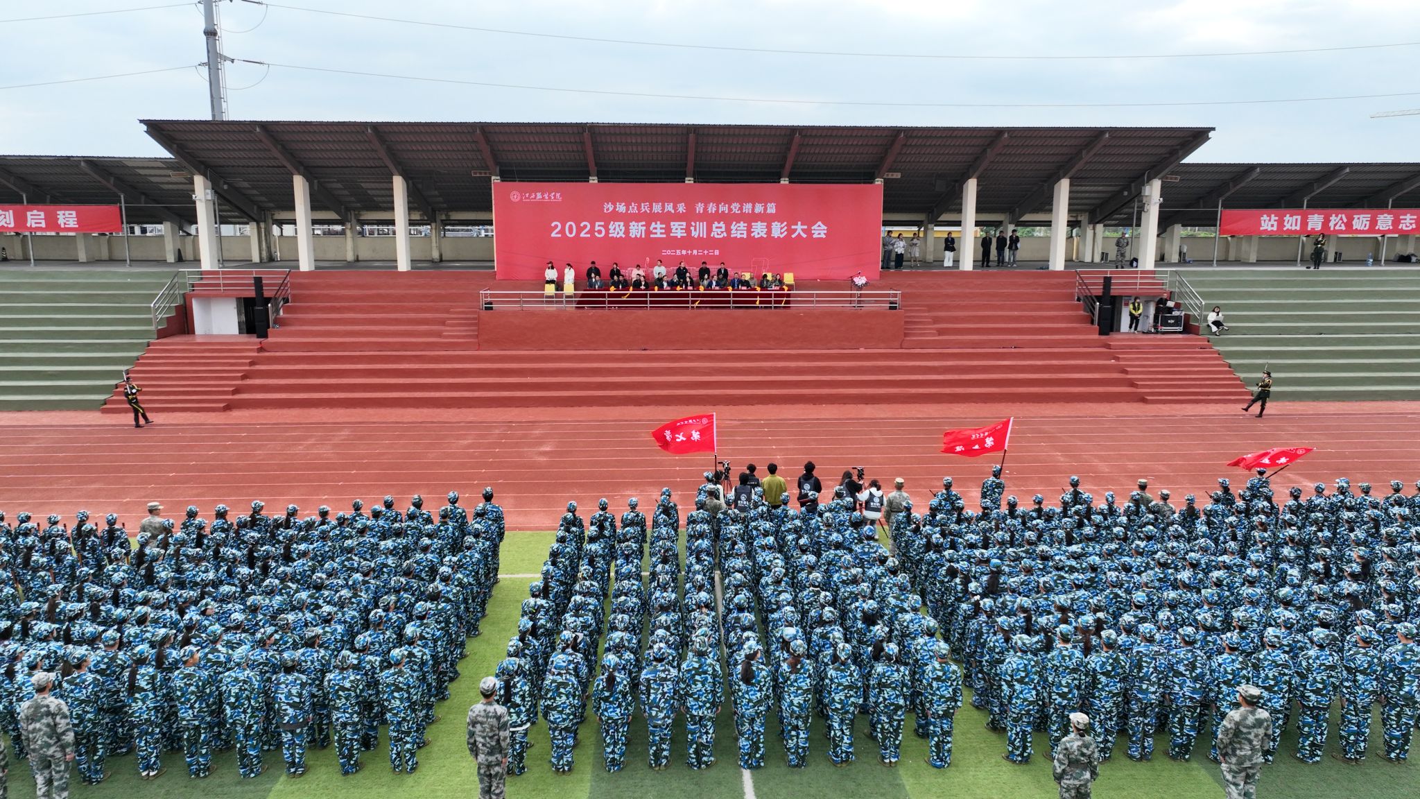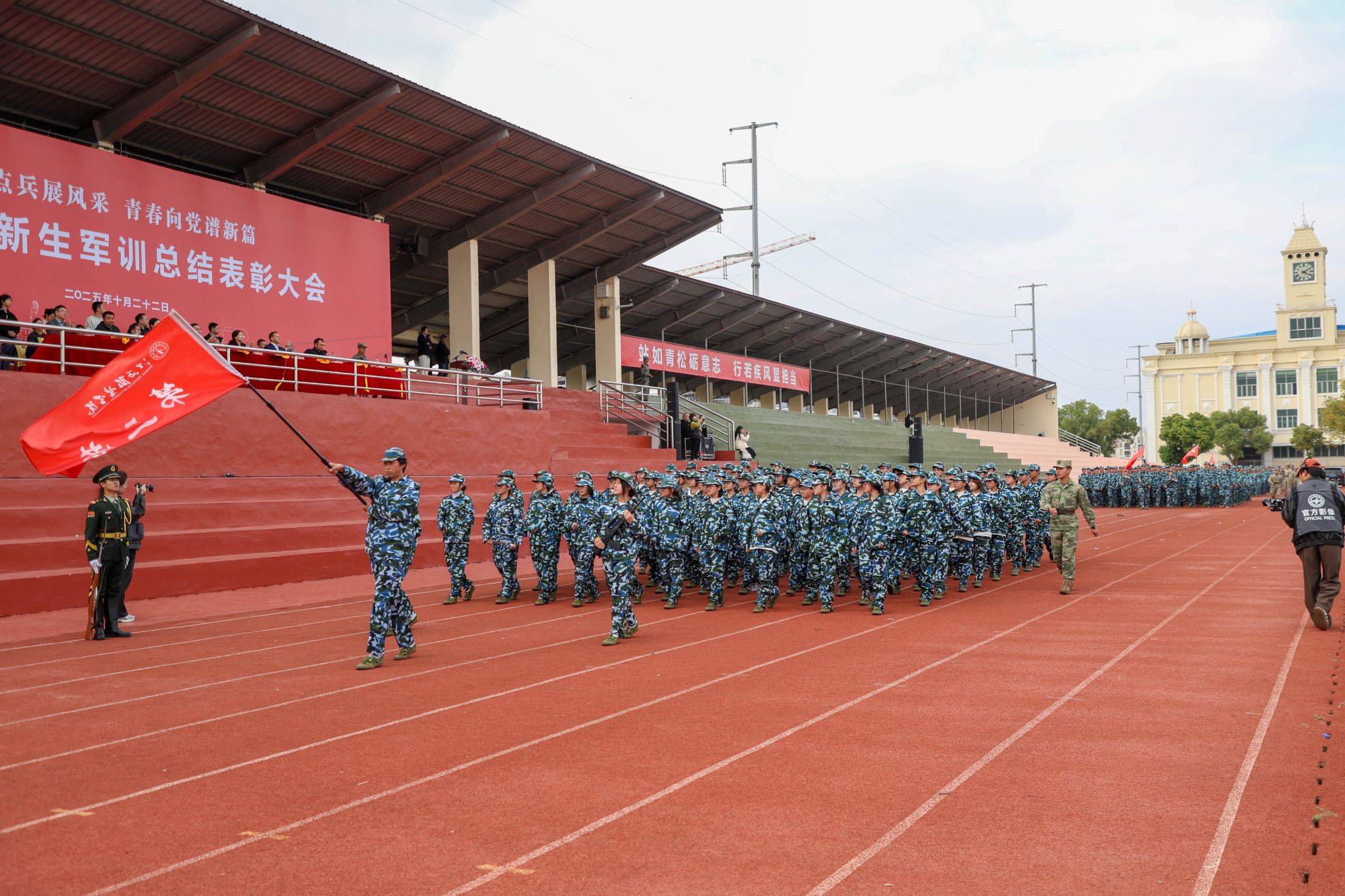 新闻中心讯(文/樊翔 图/万强 丁鹏 钟宏鹏 颜冲 梅涛 古明希 刘毅 陈浩天)秋意渐浓日,迷彩练兵时。10月22日下午,8455新葡萄娱乐场官网版2025级新生军训总结表彰大会在田径场举行。校党委书记林井萍、党委副书记唐新强出席大会,党委宣传部、学工处、教务处、团委、武装部等职能部门负责人,各学院党委(总支)书记(副书记)、学工办主任、新生辅导员、全体军训教官、2025级全体新生参加了大会。大会由人民武装部部长鲍鹏主持。