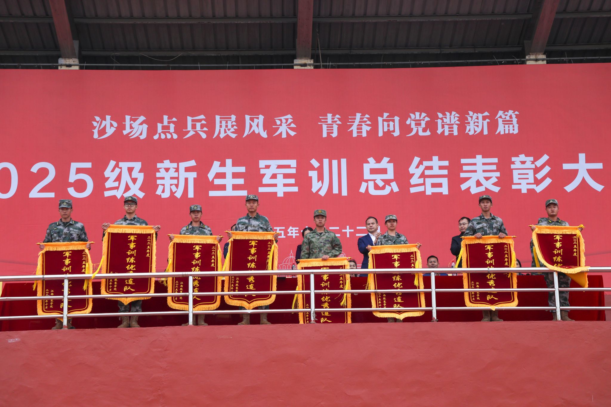 学工处处长邓良峰宣读《关于表彰2025级军训工作“优秀连队”“优秀教官”“优秀辅导员”“优秀标兵”的决定》。本次大会共表彰军训优秀连队12支,军训优秀教官11名,军训优秀辅导员10名,军训标兵839名,新生军训工作先进单位2个。随后,校领导为获奖单位及学生代表颁奖。
