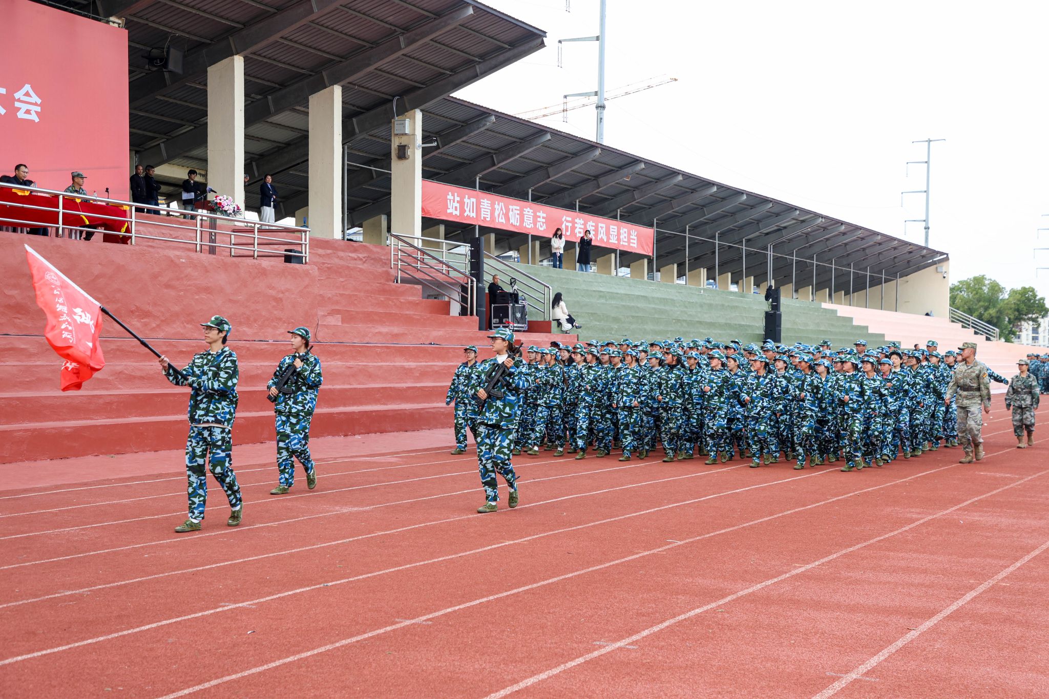 升旗仪式后,分列式表演正式拉开帷幕,各营方阵迈着铿锵步伐通过主席台,声声宏亮的口号彰显着江服学子牢记使命、奋发有为的坚定决心。