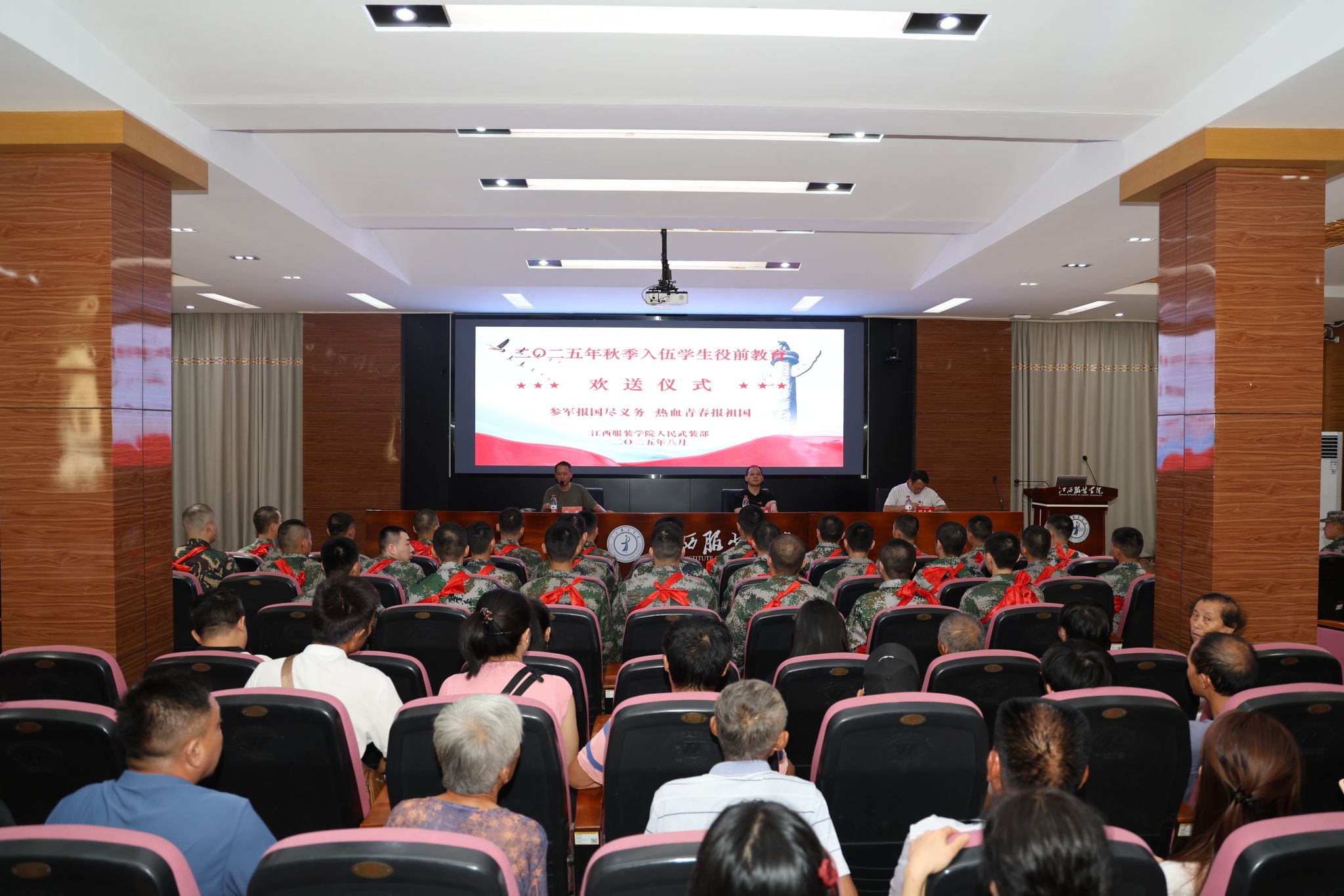 新闻中心讯(供稿/人民武装部 胡康)旌旗猎猎催奋进,青春灼灼赴戎行。8月31日,新葡萄官网在行政楼一楼报告厅举行2025年秋季预定新兵欢送会。校党委副书记唐新强,学生工作处处长邓良峰、二级学院党委书记、2025年秋季预定新兵及家长、部分辅导员和学生代表等100余人参加欢送会。大会由人民武装部部长鲍鹏主持。