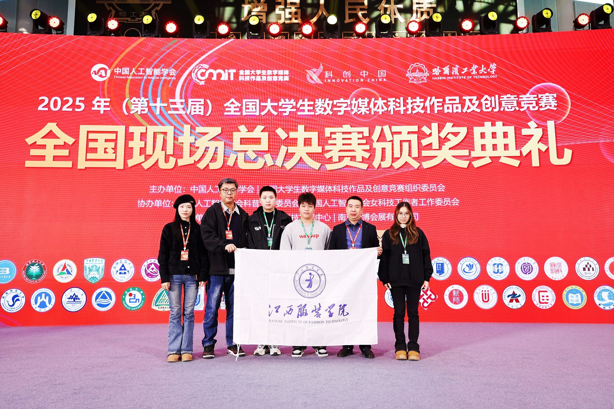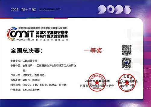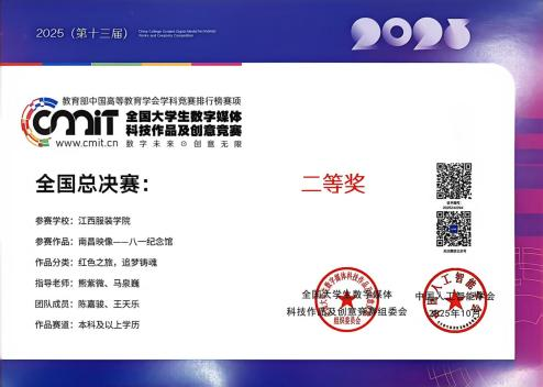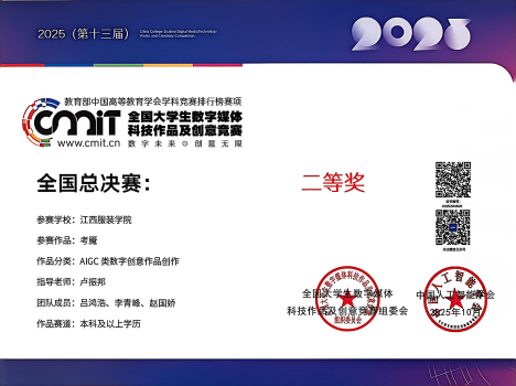 新闻中心讯(供稿/艺术设计学院)2025年(第十三届)全国大学生数字媒体科技作品及创意竞赛全国现场总决赛圆满落幕。作为教育部中国高等教育学会学科竞赛排行榜认定的国家级高水平赛事,本届大赛由中国人工智能学会联合主办,以“科技创领未来,创意变革时代”为主题,聚焦智能科技与创意设计深度融合,吸引了全国数百所高校、数十万师生参与,千余支优秀团队晋级全国总决赛。新葡萄官网学子表现优异,斩获1项一等奖和3项二等奖,其中在“民族文化,创新表达”赛道荣获全国一等奖,在“元宇宙及科幻数字作品”“红色之旅,追梦铸魂”和“AIGC数字创意作品创作”三个赛道均获二等奖,充分展现了扎实的专业能力与创新水平。