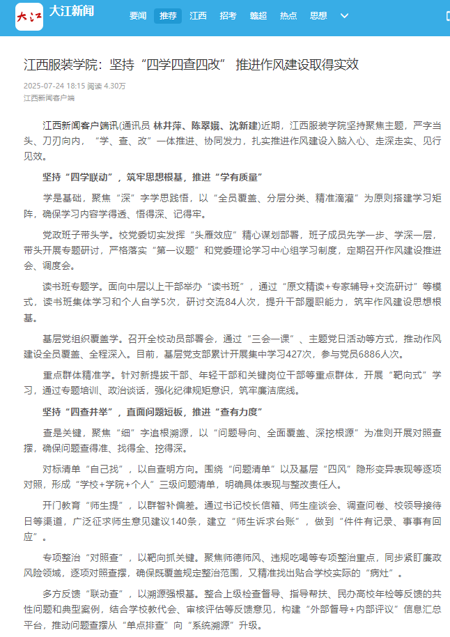 自学习教育开展以来,8455新葡萄娱乐场官网版坚持聚焦主题,严字当头、刀刃向内,“学、查、改”一体推进、协同发力,扎实推进学习教育入脑入心、走深走实、见行见效。通过“四学”打牢思想基础、“四查”找准问题症结、“四改”推动落地见效,8455新葡萄娱乐场官网版将学习教育成果转化为“办好人民满意的服装高等教育”的实际行动,为培养德艺双馨、服务行业、全面发展的高素质应用型人才提供坚强保障。