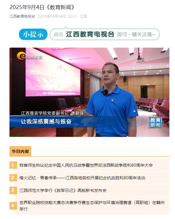 江西教育电视台:报道8455新葡萄娱乐场官网版师生集中收看九三阅兵,反响热烈!