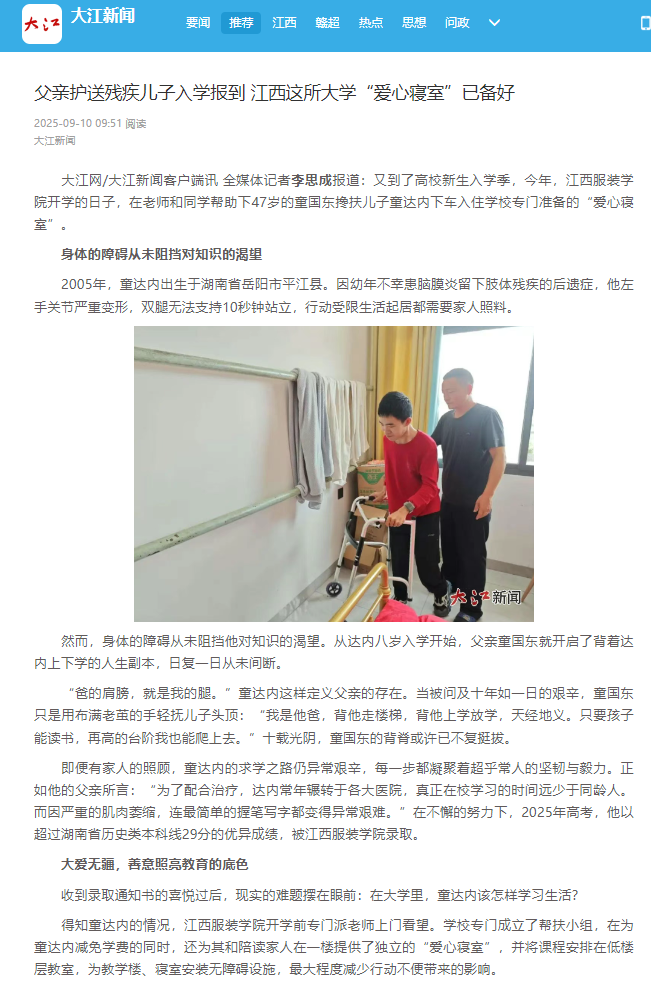 原文链接:大江新闻:父亲护送残疾儿子入学报到 江西这所大学“爱心寝室”已备好