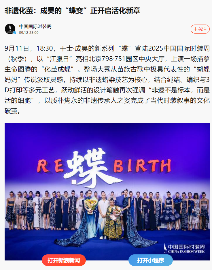 9月11日,18:30,干士·成昊的新系列“蝶”登陆2025中国国际时装周(秋季),以“江服日”亮相北京798·751园区中央大厅,上演一场描摹生命图腾的“化茧成蝶”。整场大秀从苗族古歌中极具代表性的“蝴蝶妈妈”传说汲取灵感,持续以非遗蜡染技艺为核心,结合绳结、编织与3D打印等多元工艺,跃动鲜活的设计笔触再次强调“非遗不是标本,而是活的细胞”,以质朴隽永的非遗传承人之姿完成了当代时装叙事的文化破茧。