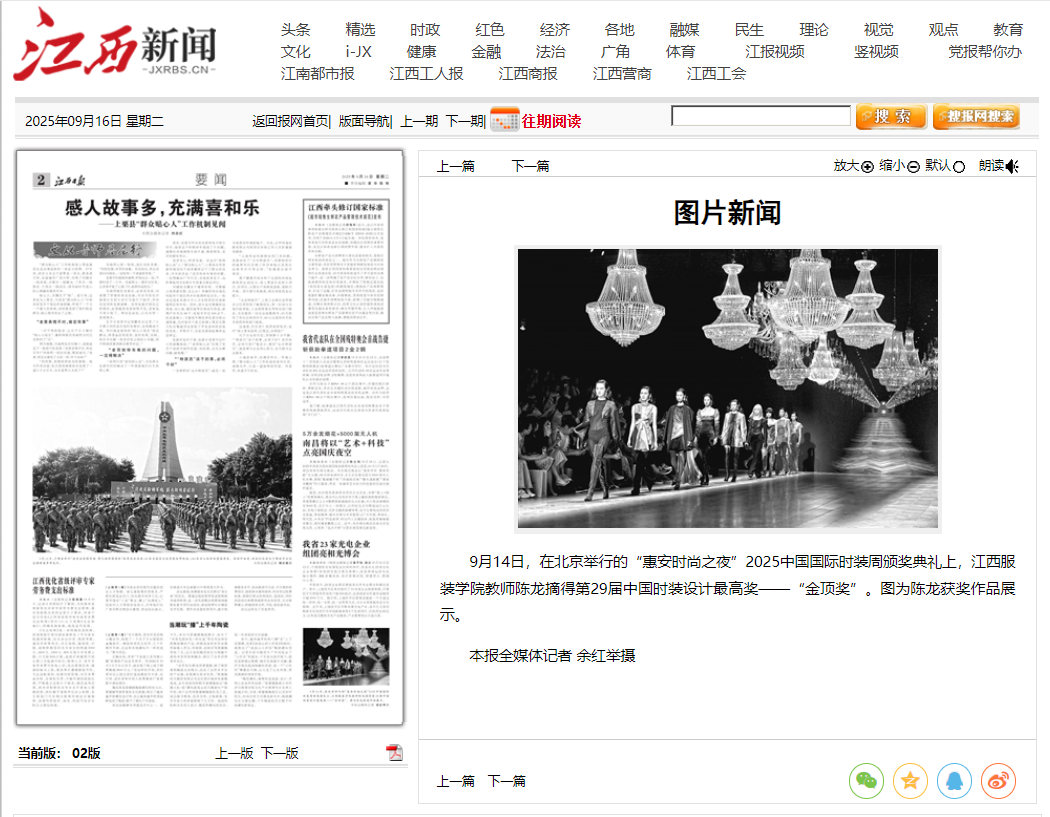 《江西日报》(2025年9月16日 第2版)刊登报道:9月14日,在北京举行的“惠安时尚之夜”2025中国国际时装周颁奖典礼上,8455新葡萄娱乐场官网版教师陈龙摘得第29届中国时装设计最高奖——“金顶奖”。图为陈龙获奖作品展示。