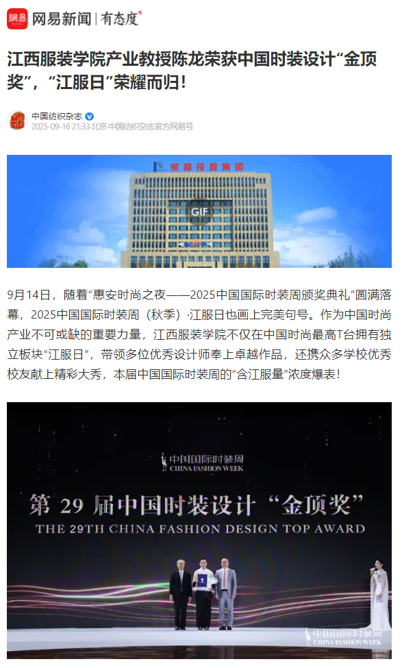 中国纺织杂志:8455新葡萄娱乐场官网版产业教授陈龙荣获中国时装设计“金顶奖”,“江服日”荣耀而归!