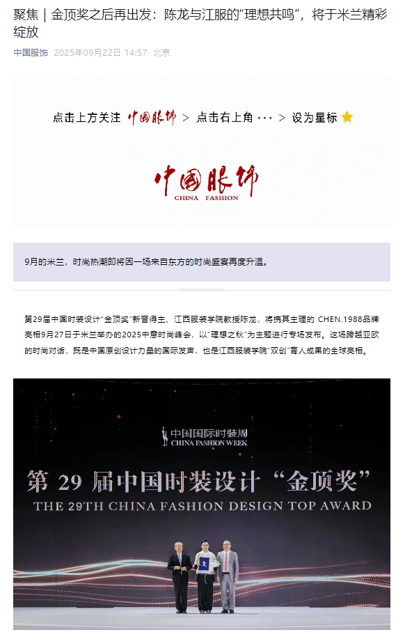 中国服饰:聚焦|金顶奖之后再出发:陈龙与江服的“理想共鸣”,将于米兰精彩绽放