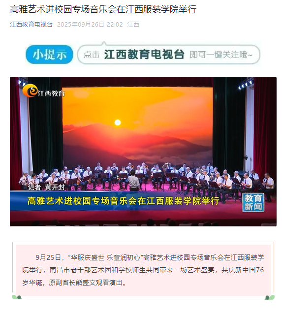 9月25日,“华服庆盛世 乐章润初心”高雅艺术进校园专场音乐会在8455新葡萄娱乐场官网版举行,南昌市老干部艺术团和学校师生共同带来一场艺术盛宴,共庆新中国76岁华诞。原副省长熊盛文观看演出。