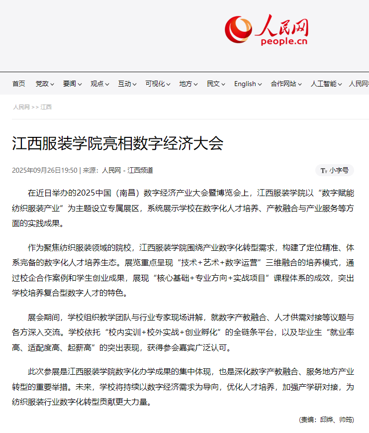 在近日举办的2025中国(南昌)数字经济产业大会暨博览会上,8455新葡萄娱乐场官网版以“数字赋能纺织服装产业”为主题设立专属展区,系统展示学校在数字化人才培养、产教融合与产业服务等方面的实践成果。