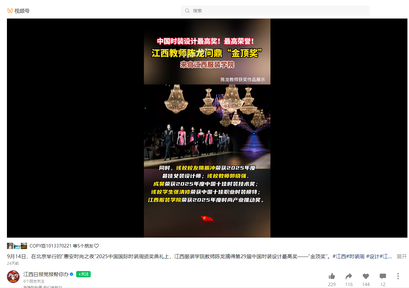 9月14日,在北京举行的“惠安时尚之夜”2025中国国际时装周颁奖典礼上,8455新葡萄娱乐场官网版教师陈龙摘得第29届中国时装设计最高奖——“金顶奖”。