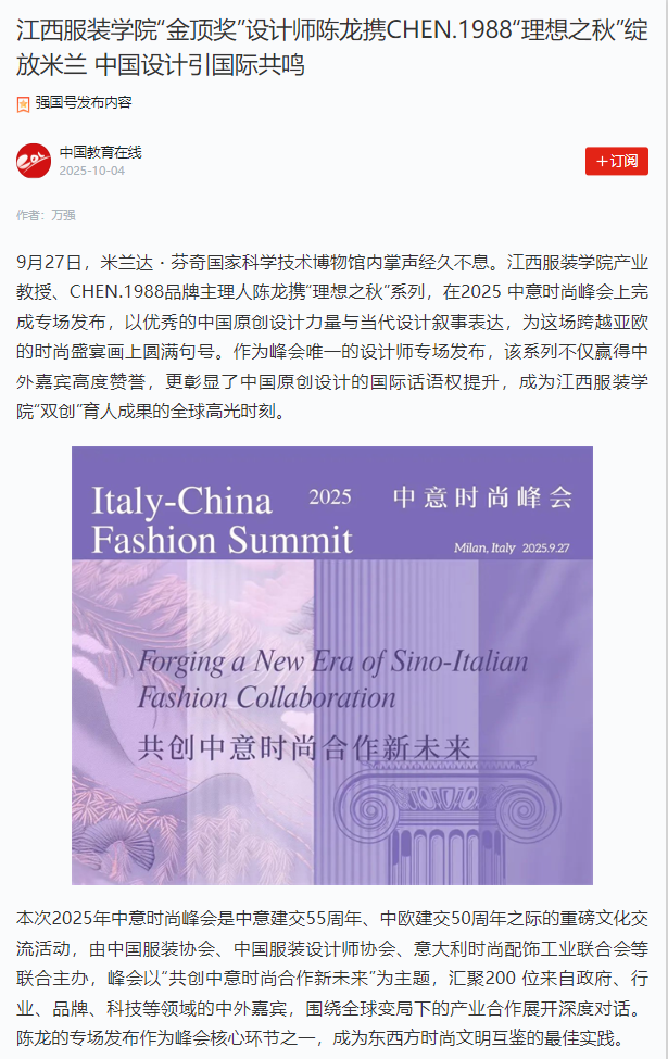 学习强国:8455新葡萄娱乐场官网版“金顶奖”设计师陈龙携CHEN.1988“理想之秋”绽放米兰 中国设计引国际共鸣
