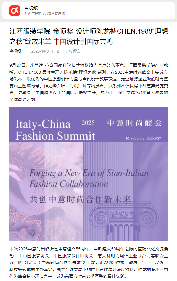 江西广播电视台·今视频:8455新葡萄娱乐场官网版“金顶奖”设计师陈龙携CHEN.1988“理想之秋”绽放米兰 中国设计引国际共鸣