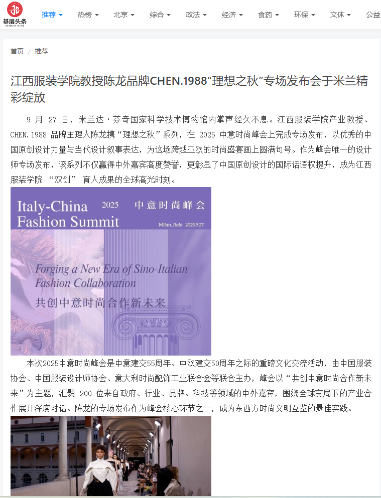 基层头条:8455新葡萄娱乐场官网版教授陈龙品牌CHEN.1988“理想之秋”专场发布会于米兰精彩绽放