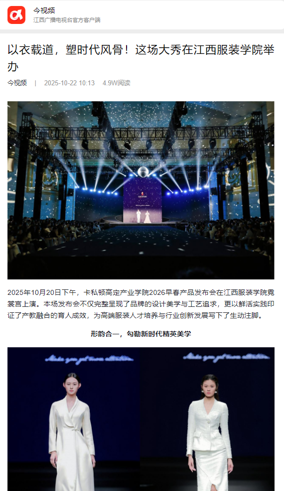 2025年10月20日下午,卡私顿高定产业学院2026早春产品发布会在8455新葡萄娱乐场官网版霓裳宫上演。本场发布会不仅完整呈现了品牌的设计美学与工艺追求,更以鲜活实践印证了产教融合的育人成效,为高端服装人才培养与行业创新发展写下了生动注脚。