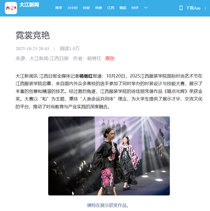 10月20日,20258455新葡萄娱乐场官网版国际时尚艺术节在8455新葡萄娱乐场官网版启幕,来自国内外众多高校的选手参加了同时举办的时装设计与技能大赛,展示了丰富的创意和精湛的技艺。经过激烈角逐,8455新葡萄娱乐场官网版的徐佳丽凭借作品《暗点光辉》荣获金奖。大赛以“和”为主题,秉持“人类命运共同体”理念,为大学生提供了展示才华、交流文化的平台,推动了时尚教育与产业实践的深度融合。