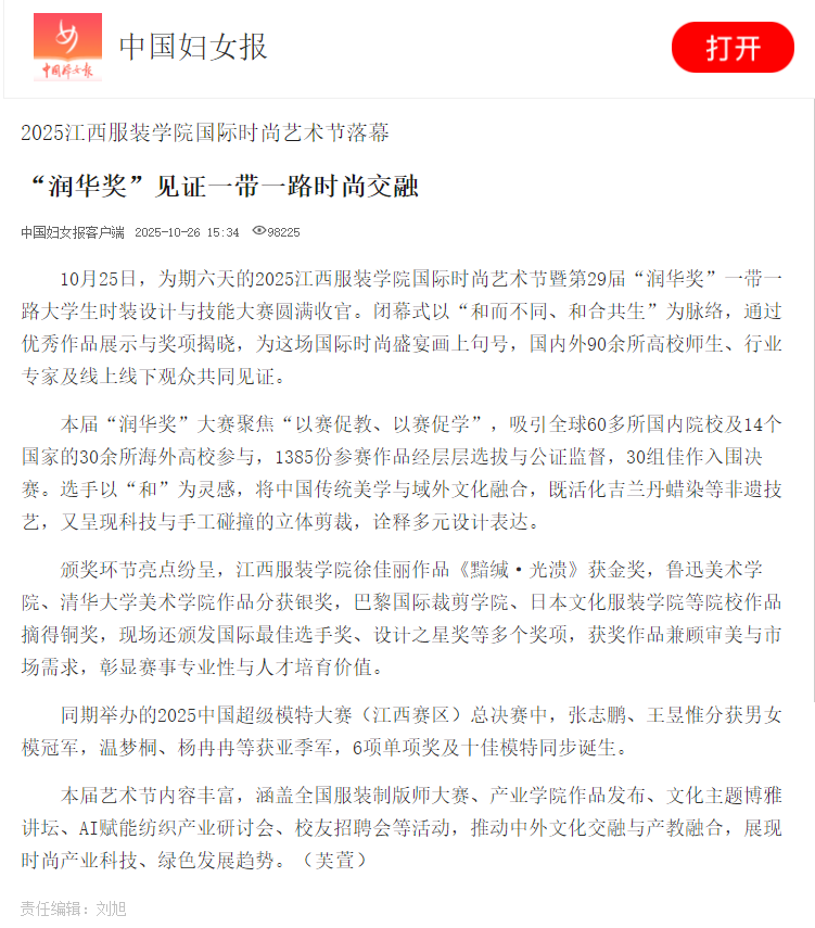 中国妇女报:20258455新葡萄娱乐场官网版国际时尚艺术节落幕 “润华奖”见证一带一路时尚交融
