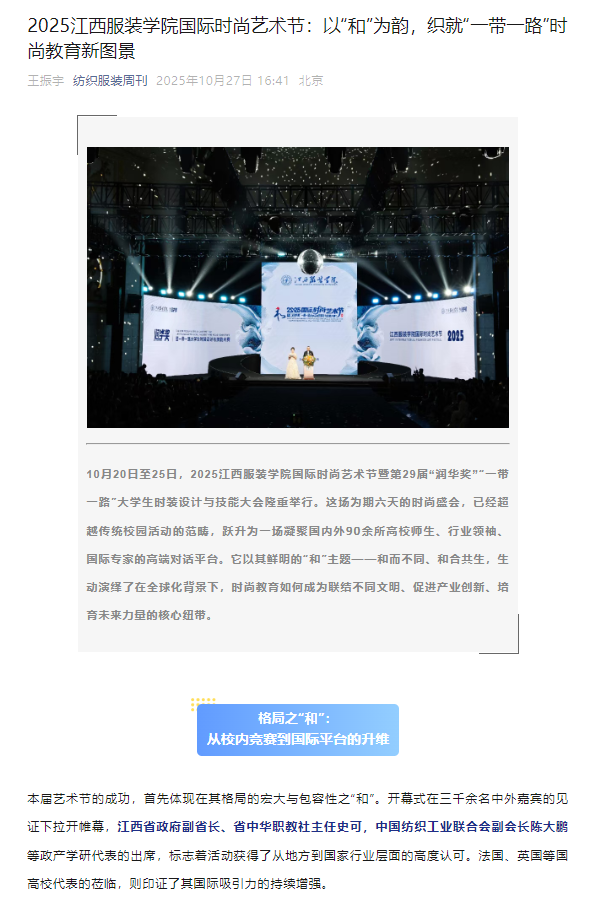 纺织服装周刊:20258455新葡萄娱乐场官网版国际时尚艺术节:以“和”为韵,织就“一带一路”时尚教育新图景