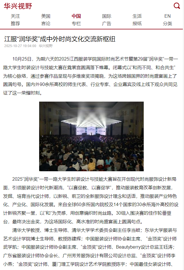 美国华兴报:江服“润华奖”成中外时尚文化交流新枢纽