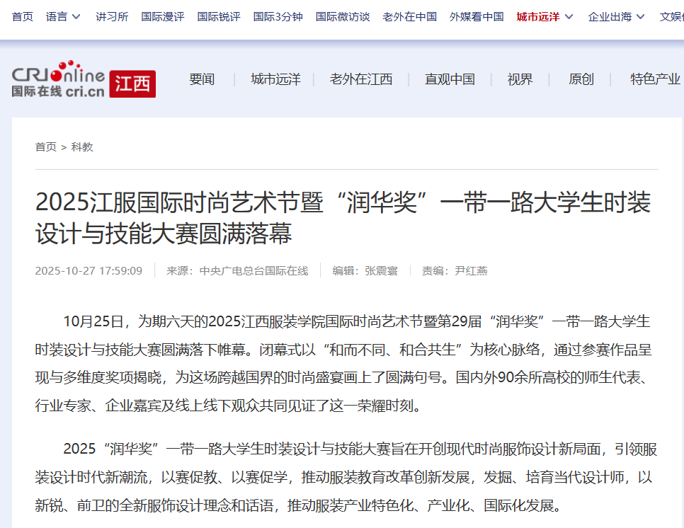 中央广电总台国际在线:2025江服国际时尚艺术节暨“润华奖”一带一路大学生时装设计与技能大赛圆满落幕